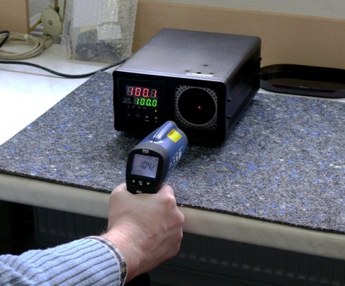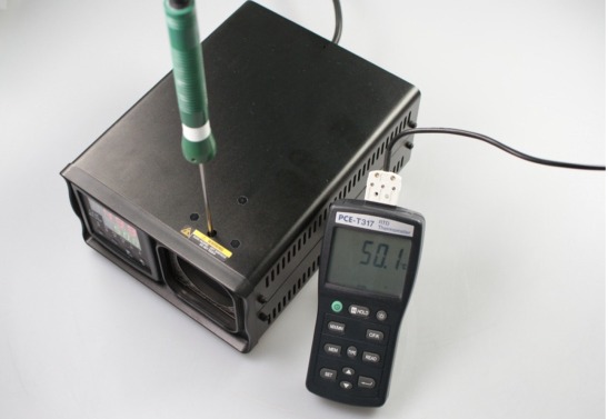 Questa immagine mostra il calibratore di temperatura PCE-IC1 mentre verifica la precisione di un misuratore di temperatura ad infrarossi